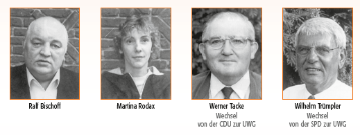 Ralf Bischoff; Martina Rodax; Werner Tacke (Wechsel von der CDU zur UWG) und Wilhelm Trümpler (Wechsel von der SPD zur UWG)